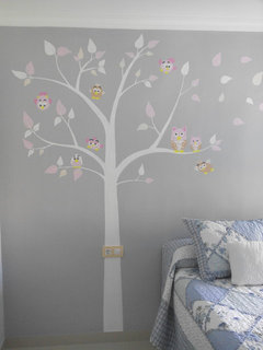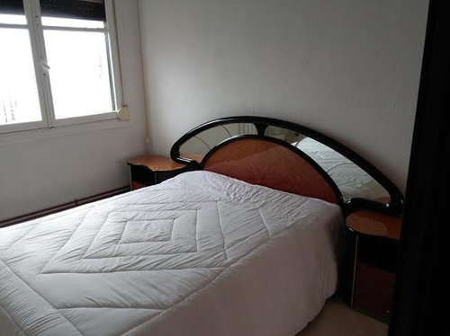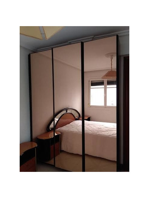 Al ser un dormitorio el mayor protagonismo es de la cama. Es un espacio pequeño por lo que en caso de dar algun color yo lo pondria unicamente en la pared protagonista del cabecero, y de un tono claro. En caso de no querer cambiar el mobiliario, puedes darle otro aire y pintarlo de otro color mas actual.