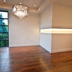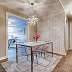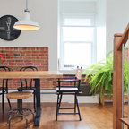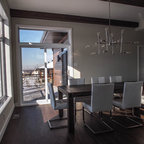 Imagen de comedor actual con paredes grises y suelo de madera oscura — Houzz