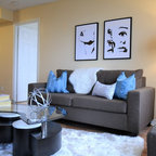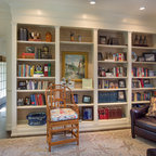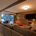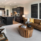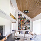 Foto de sala de estar con biblioteca actual con paredes grises y suelo de madera oscura — Houzz