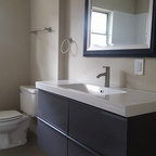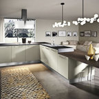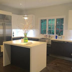 Ejemplo de cocina comedor minimalista con armarios con paneles lisos, puertas de armario blancas y electrodomésticos de acero inoxidable — Houzz
