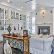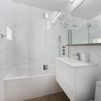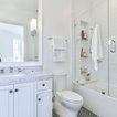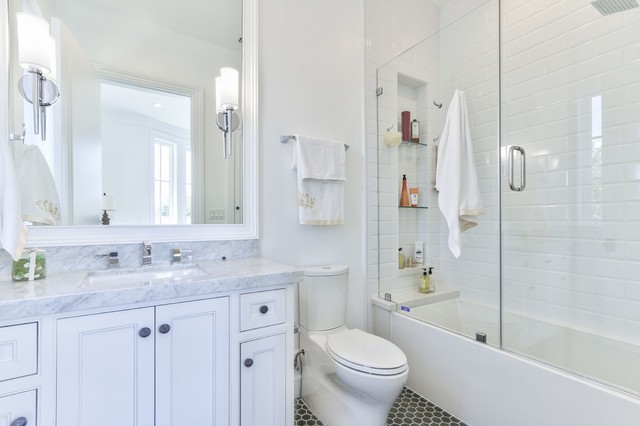 Ejemplo de cuarto de baño con ducha, tradicional, con armarios con rebordes decorativos, puertas de armario blancas, bañera empotrada, combinación de ducha y bañera, baldosas y/o azulejos blancos, paredes blancas, lavabo bajoencimera, suelo gris y ducha con puerta con bisagras — Houzz