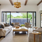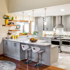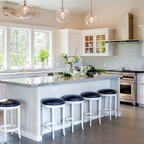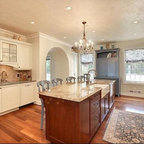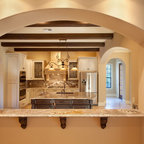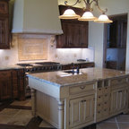 Imagen de cocina en U, mediterránea, con una isla, armarios estilo shaker, puertas de armario blancas, salpicadero verde, salpicadero de losas de piedra, suelo de madera oscura y suelo marrón — Houzz
