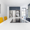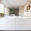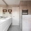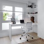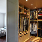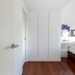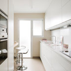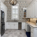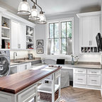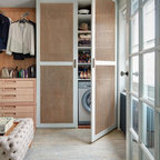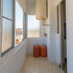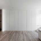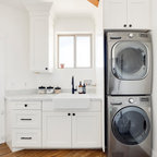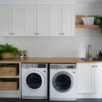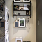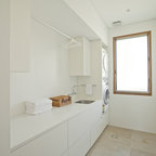 Diseño de lavadero actual con paredes blancas, suelo gris y suelo de madera clara — Houzz