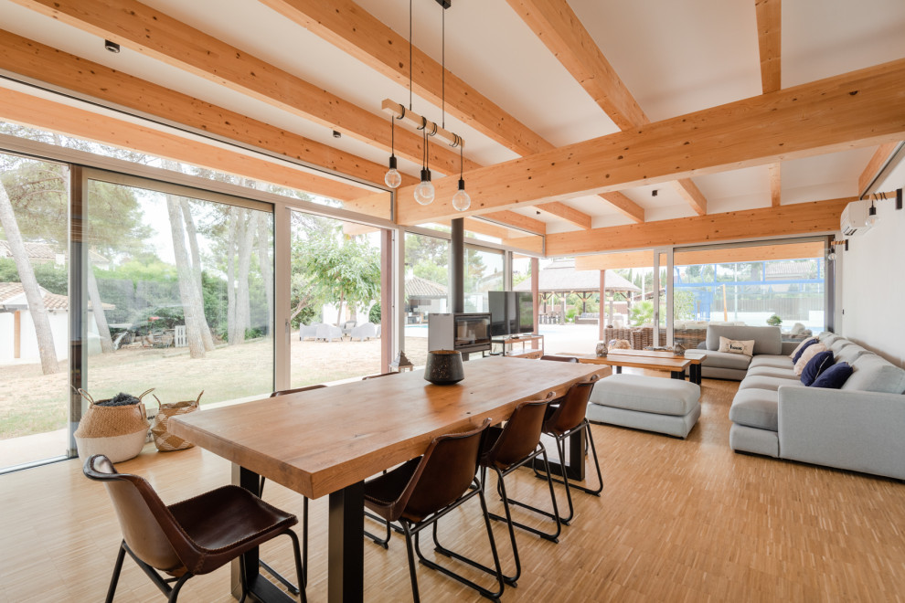 Ampliación Casa L - Acogedor salón con vigas de madera y grandes ventanales