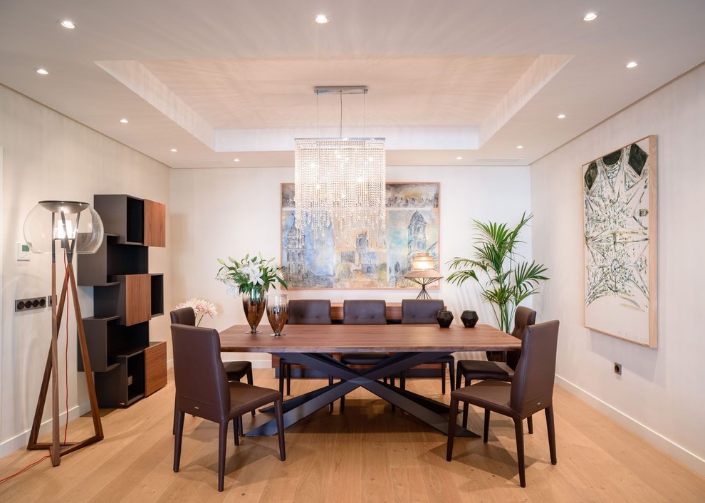 Vista general del comedor con mesa de madera en nogal canaletto, con un pie espectacular en acero gofrado color grafito. Las sillas están tapizadas en cuero marrón. La lámpara de techo es un diseño italiano, así como la de pie.