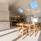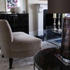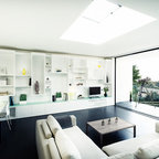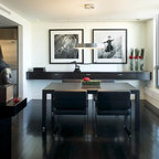 Diseño de salón actual, grande, con paredes blancas, suelo de madera oscura y suelo negro — Houzz