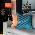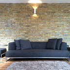 Love the piping colour contrast on the sofa with the dramatic dark statement wall.