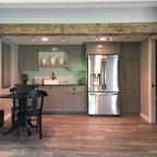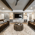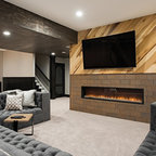 Imagen de sótano con ventanas de estilo de casa de campo, de tamaño medio, con paredes blancas, moqueta, chimenea tradicional, marco de chimenea de baldosas y/o azulejos y suelo beige — Houzz