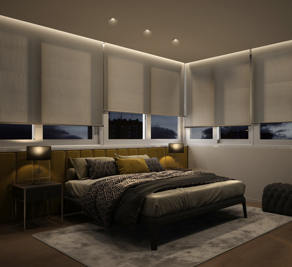 Unión de ático y sobre ático mediante escalera en patio exterior. La planta superior gira a través del cuerpo central circular que aloja el cuarto de baño, revestido con un mural de mosaico. Colores oscuros e iluminación muy tenue para lograr un hogar muy intimista.