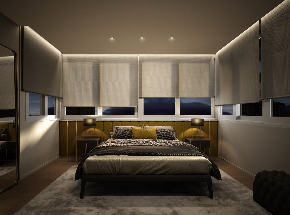 Unión de ático y sobre ático mediante escalera en patio exterior. La planta superior gira a través del cuerpo central circular que aloja el cuarto de baño, revestido con un mural de mosaico. Colores oscuros e iluminación muy tenue para lograr un hogar muy intimista.