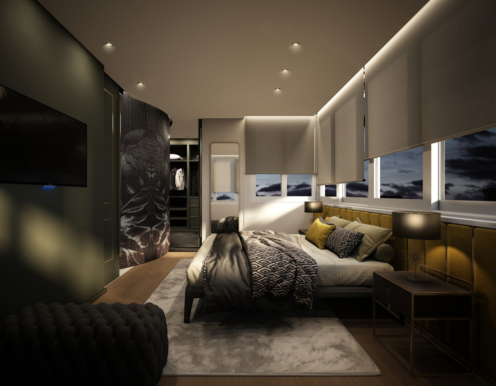 Unión de ático y sobre ático mediante escalera en patio exterior. La planta superior gira a través del cuerpo central circular que aloja el cuarto de baño, revestido con un mural de mosaico. Colores oscuros e iluminación muy tenue para lograr un hogar muy intimista.