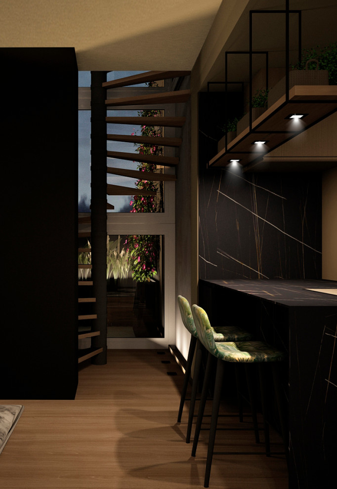 Unión de ático y sobre ático mediante escalera en patio exterior. La planta superior gira a través del cuerpo central circular que aloja el cuarto de baño, revestido con un mural de mosaico. Colores oscuros e iluminación muy tenue para lograr un hogar muy intimista.