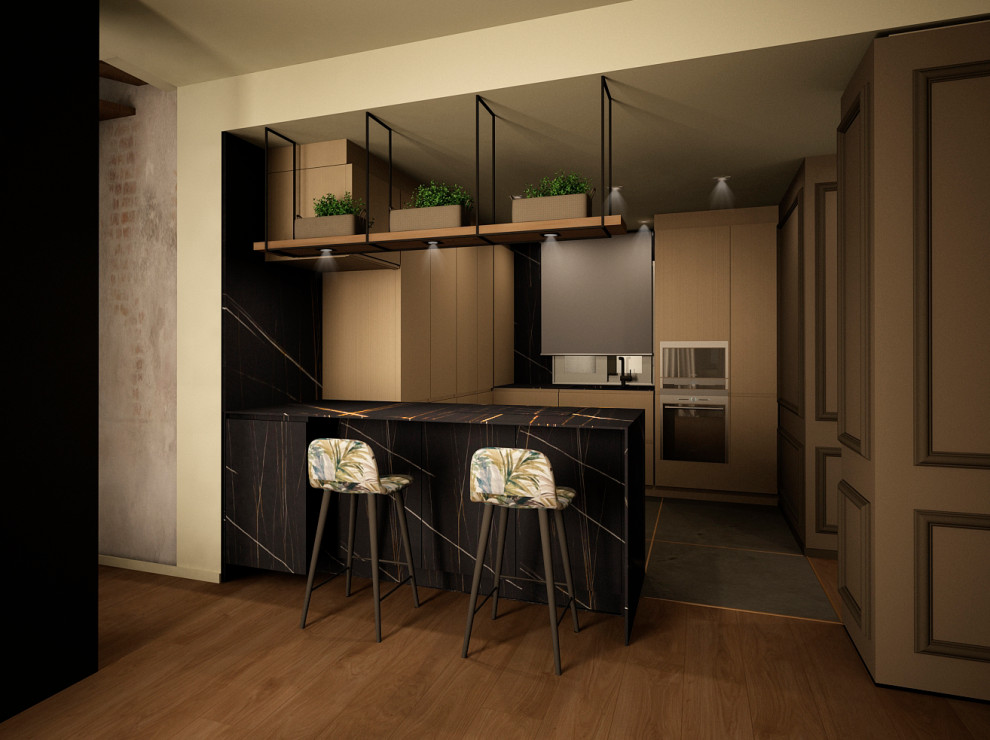 Unión de ático y sobre ático mediante escalera en patio exterior. La planta superior gira a través del cuerpo central circular que aloja el cuarto de baño, revestido con un mural de mosaico. Colores oscuros e iluminación muy tenue para lograr un hogar muy intimista.