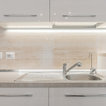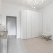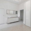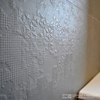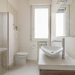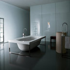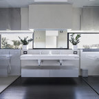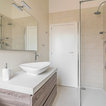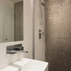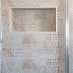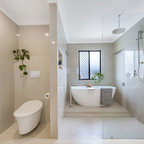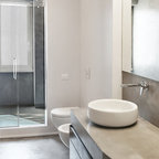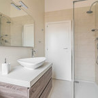 Ejemplo de cuarto de baño con ducha, contemporáneo, de tamaño medio, con puertas de armario de madera clara, ducha esquinera, baldosas y/o azulejos de cerámica, paredes blancas, suelo de baldosas de cerámica, lavabo sobreencimera, encimera de madera, ducha abierta y encimeras blancas — Houzz
