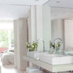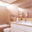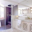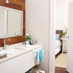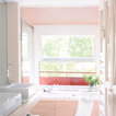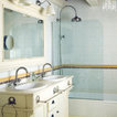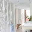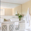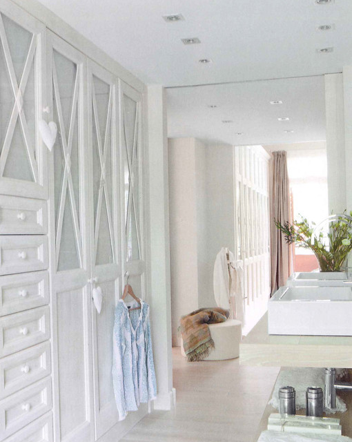 Foto de cuarto de baño principal, tradicional renovado, extra grande, con lavabo con pedestal, armarios abiertos, puertas de armario blancas, encimera de madera, baldosas y/o azulejos blancos, paredes blancas y suelo de madera clara — Houzz