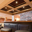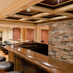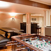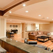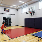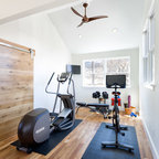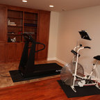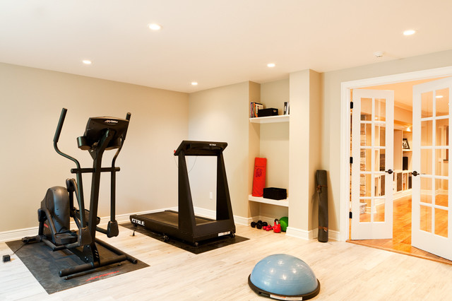 Light and bright lower level home gym with double french doors and Armstrong brand faux pickled wood grain vinyl floating floor installed over Dri-core brand subfloor.