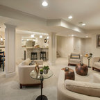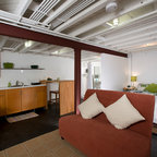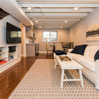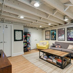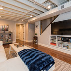 Modelo de sótano con ventanas tradicional renovado con paredes blancas, suelo de cemento y suelo marrón — Houzz