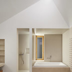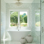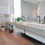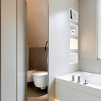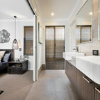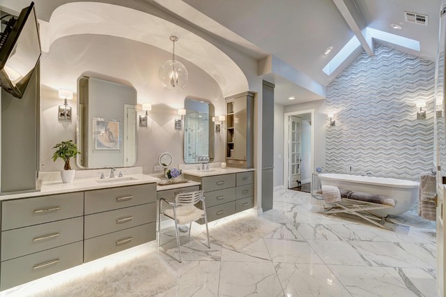 Foto de cuarto de baño principal, contemporáneo, con armarios con paneles lisos, puertas de armario grises, bañera exenta, baldosas y/o azulejos grises, paredes grises, lavabo bajoencimera y suelo blanco — Houzz