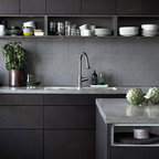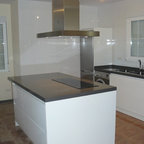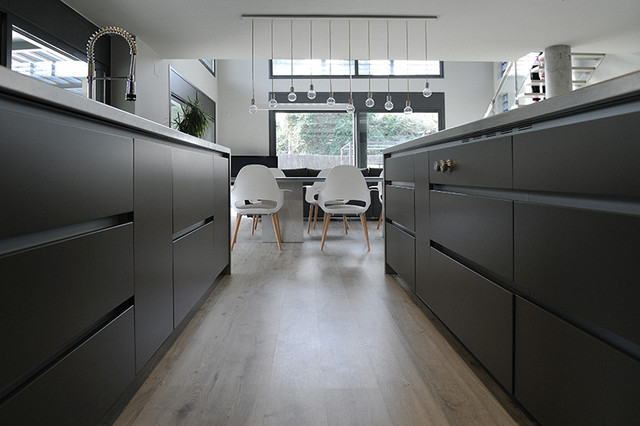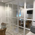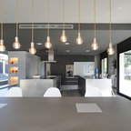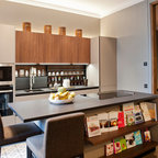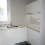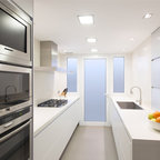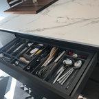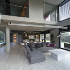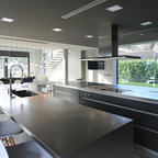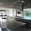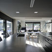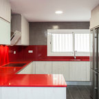 Nuestras actuaciones en esta vivienda de reciente construcción se han centrado en transformar la planta baja en un único espacio conjunto para sala de estar, comedor, cocina y recibidor. Distribuido por el mismo mobiliario, en buena parte de diseño propio, el espacio interior se asoma al exterior a través de los grandes ventanales y puertas correderas que lo conectan con el exterior. Precisamente en esta conexión entre el interior y el exterior hemos participado con la instalación de una coraza motorizada sobre los grandes ventanales superiores para poder calibrar la entrada de luz solar del exterior. Así mismo, nos hemos encargado del ajardinamiento de una parte del exterior donde hemos montado una cubierta remobible con una parte motorizada, ganando espacio habitable para los meses del buen tiempo.