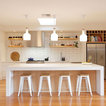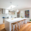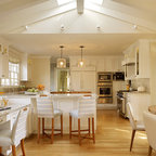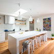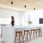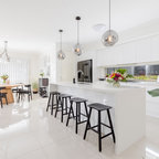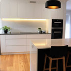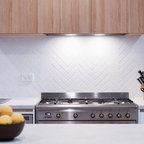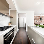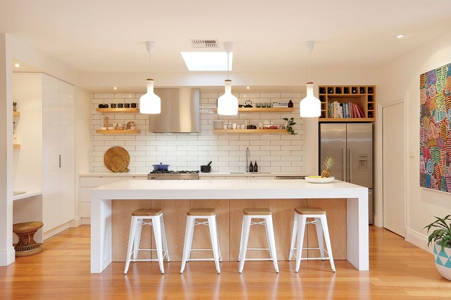 Imagen de cocina de galera, escandinava, de tamaño medio, con fregadero bajoencimera, armarios con paneles lisos, puertas de armario blancas, salpicadero blanco, electrodomésticos de acero inoxidable, una isla, salpicadero de azulejos tipo metro y suelo de madera en tonos medios — Houzz