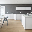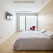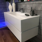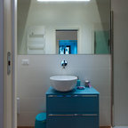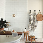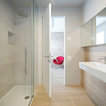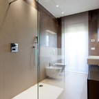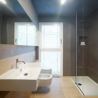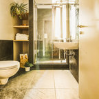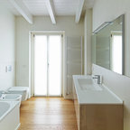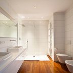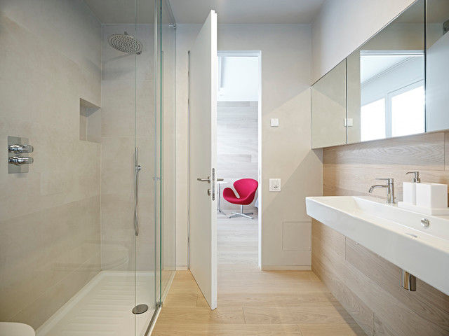 Imagen de cuarto de baño contemporáneo con suelo de madera clara, ducha a ras de suelo, paredes beige y lavabo de seno grande — Houzz