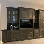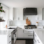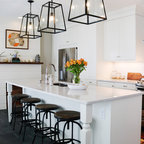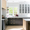 Imagen de cocina en L, clásica renovada, con armarios estilo shaker, puertas de armario negras, electrodomésticos de acero inoxidable, suelo de madera clara, una isla, suelo beige y encimeras blancas — Houzz