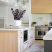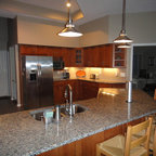 Like 2-tone cabinetry; use of wood; pendant light; glass uppers.