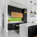 Black white and wood tones done well here...