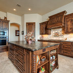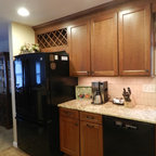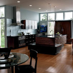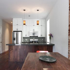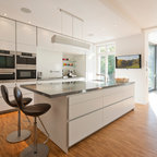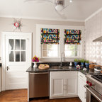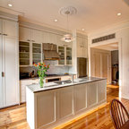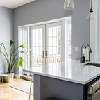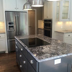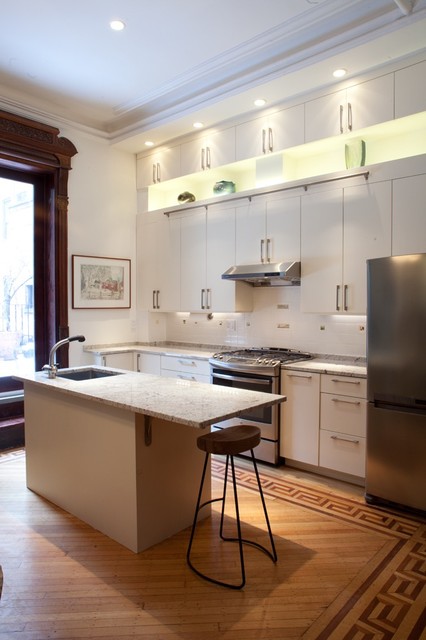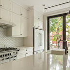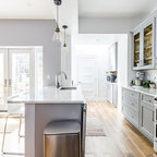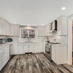 Modelo de cocina comedor en L, clásica renovada, grande, con fregadero bajoencimera, armarios con paneles lisos, puertas de armario blancas, encimera de granito, salpicadero blanco, salpicadero de azulejos de cerámica, electrodomésticos de acero inoxidable, suelo de madera en tonos medios y una isla — Houzz