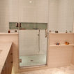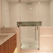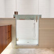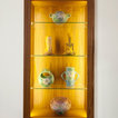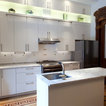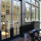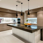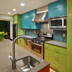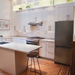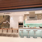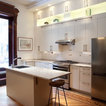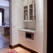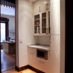 The kitchen boasts ample storage. The challenge was adding a wall of cabinetry without it feeling too sheer and heavy. Adding a back lit, open shelf below the uppermost cabinets adds depth and drama to the wall of cabinets, making the wall lighter and interesting. The library ladder adds interest and easy access to the upper cabinets.