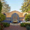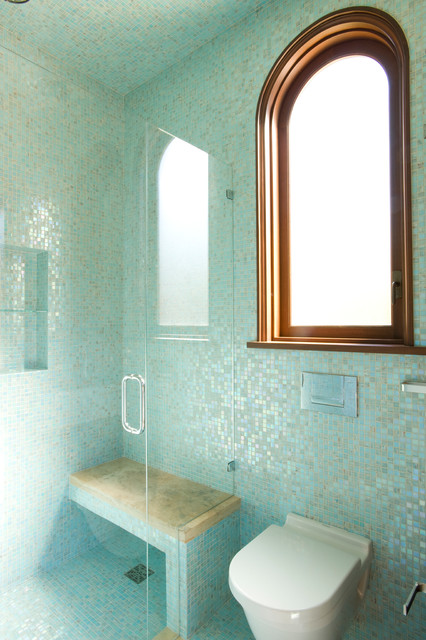 Modelo de cuarto de baño mediterráneo, pequeño, con sanitario de pared, baldosas y/o azulejos azules, baldosas y/o azulejos en mosaico, armarios con paneles lisos, puertas de armario de madera en tonos medios, suelo con mosaicos de baldosas y lavabo bajoencimera — Houzz
