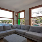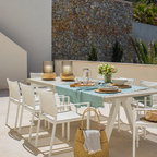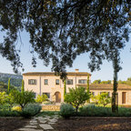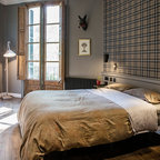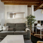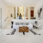 Foto de biblioteca en casa mediterránea, sin televisor, con paredes blancas, chimenea tradicional y suelo marrón — Houzz