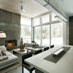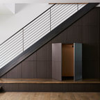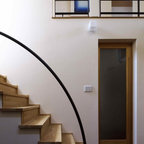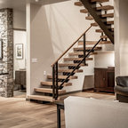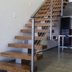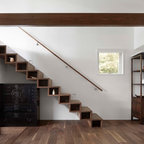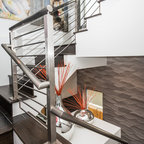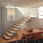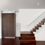 Foto de escalera moderna, sin contrahuella, con escalones de madera y barandilla de vidrio — Houzz