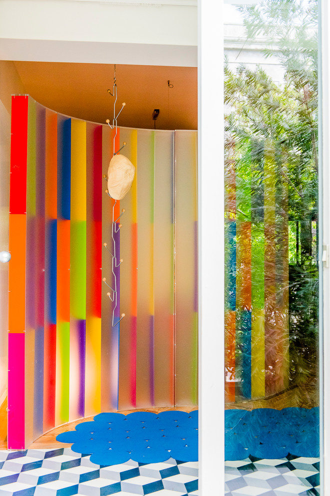 Además de separar el acceso del comedor y el estar, el despliegue de color del biombo funciona como un anticipo del...