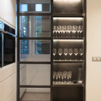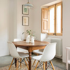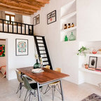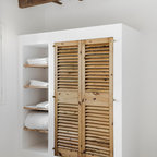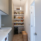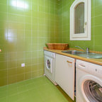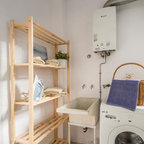 Diseño de cuarto de lavado lineal, mediterráneo, de tamaño medio, con armarios con paneles lisos, puertas de armario blancas, encimera de madera, suelo de madera oscura, suelo marrón y paredes blancas — Houzz