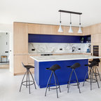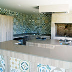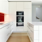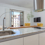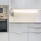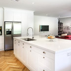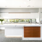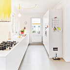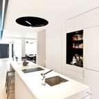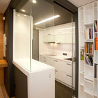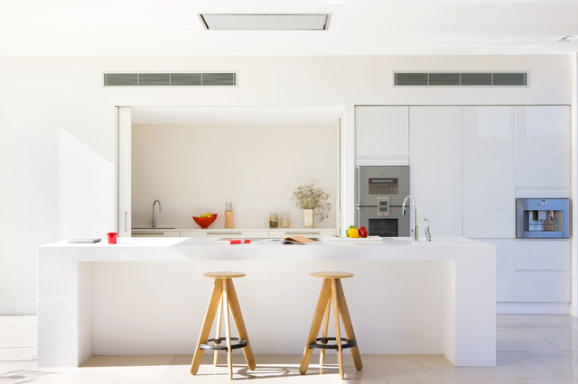 Modelo de cocina comedor de galera, actual, de tamaño medio, con fregadero integrado, armarios con paneles lisos, puertas de armario blancas, encimera de acrílico, salpicadero blanco, electrodomésticos de acero inoxidable, suelo de travertino y una isla — Houzz
