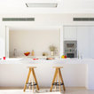 suelo de madera sin barnizar, taburetes madera, mbiliario cocina blanco