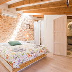 7. Con paredes de ayer y piezas de hoyLas paredes de piedra, vigas restauradas y bóvedas aportan personalidad y combinan a la perfección con los muebles contemporáneos. Es la esencia del Nuevo Rústico.En detalle: En este dormitorio en Ibiza, los accesorios están muy bien elegidos. Fíjate en el espejo con marco de madera maciza, la lámpara Cesta, de Miguel Milá, y una alfombra de pelo de oveja en color gris.Conoce la lámpara Cesta, un clásico español (que parece japonés)