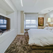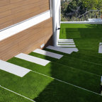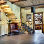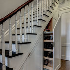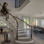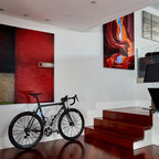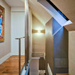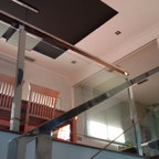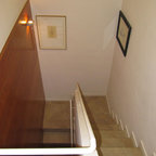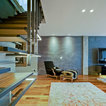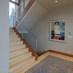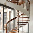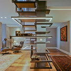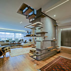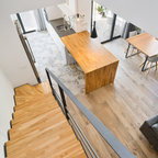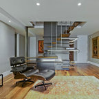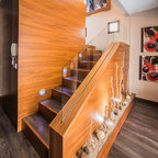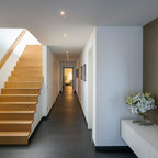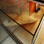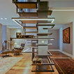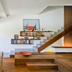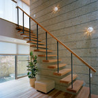 Modelo de escalera en L, minimalista, grande, sin contrahuella, con escalones de madera — Houzz