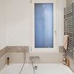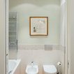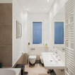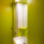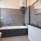 Ejemplo de cuarto de baño actual con bañera encastrada, sanitario de pared, baldosas y/o azulejos de cerámica, paredes verdes, suelo de madera clara y combinación de ducha y bañera — Houzz
