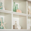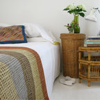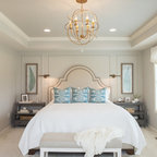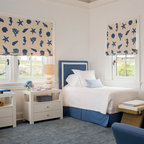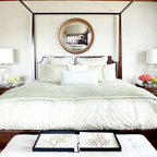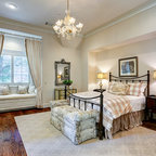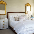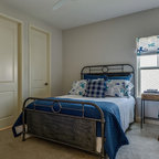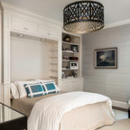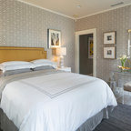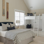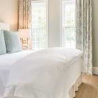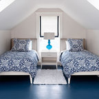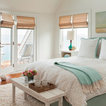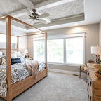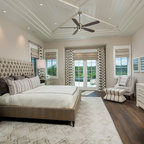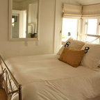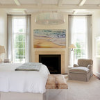 Diseño de dormitorio principal, costero, de tamaño medio, con paredes blancas y suelo de madera en tonos medios — Houzz