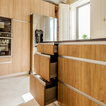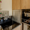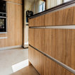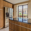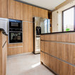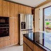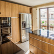 De un vistazoQuién cocina aquí: Una familiaSituación: MadridSuperficie: 15 metros cuadradosProyecto: Grupo CoecoPresupuesto: 13.700 € + IVALos muebles de esta cocina se han diseñado con un material estratificado que ofrece el aspecto de la madera. “Es uno de nuestros materiales de gama prémium en el que ofrecemos 30 años de garantía. Es muy resistente y se limpia fácilmente”, cuenta Almudena García. Las encimeras son de granito negro intenso, un material resistente y natural –de manera general suele costar a partir de 240 € el metro lineal, como contábamos en este reportaje sobre precios de encimeras para la cocina–.