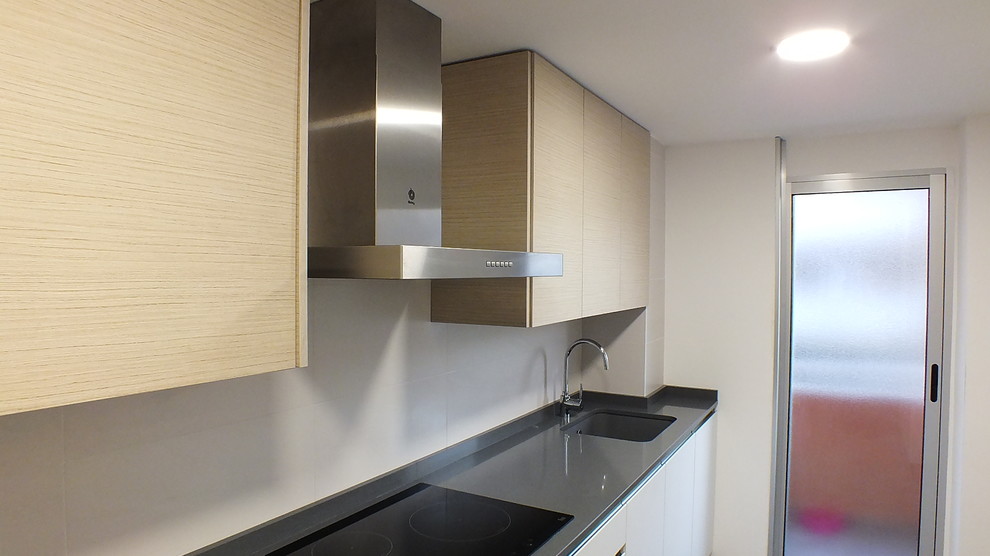 Aprovechar al máximo el espacio de la cocina que era estrecha y alargada, usando muebles de cocina que doblasen el espacio de almacenamiento y encimera para trabajar.