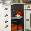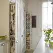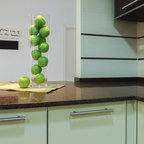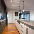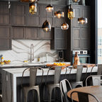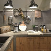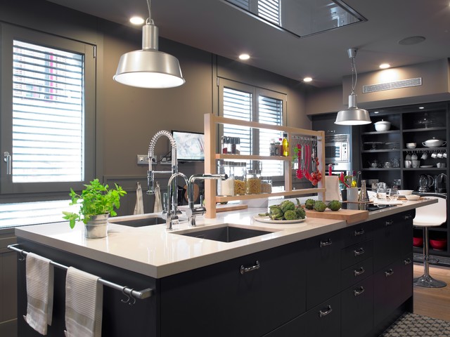 Un original marco de madera abierto sobre la encimera. Es una idea perfecta para colocar aceites y especias: ganas espacio y tienes las cosas a mano. También es interesante porque da un toque de cocina industrial en un entorno hogareño, con muebles negros y grandes lámparas que iluminan la isla.Consejo Houzz: introduce una barra para colgar cucharones y espátulas para cocinar.