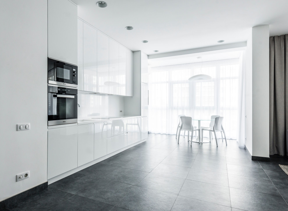 Aquí tenemos otra perspectiva de la cocina, la cual se limita a tener mucha decoración siendo esto una gran característica de un estilo minimalista. Siendo el blanco el color predominante, la entrada de luz natural crea un ambiente reluciente y elegante. ¡Contáctese con nosotros para recibir mayor información sobre cómo puede rediseñar su hogar!