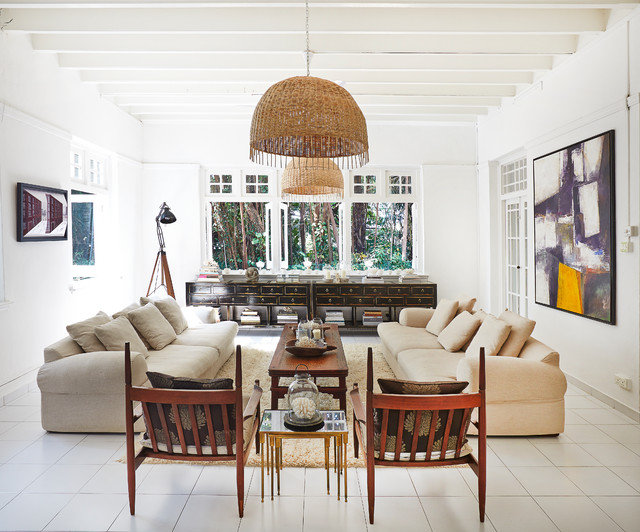 Ejemplo de salón para visitas cerrado, tropical, sin chimenea y televisor, con paredes blancas y suelo blanco — Houzz