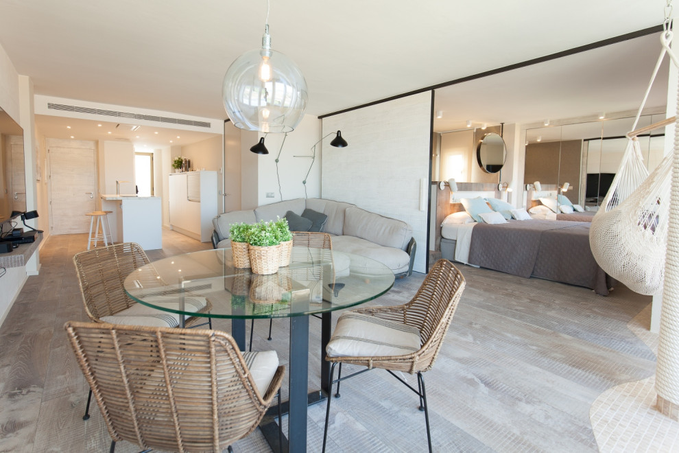 El comedor se incluye en el espacio abierto que conforma todo el piso, no hay barreras entre cocina, salón y comedor, permitiendo que desde cualquier punto se pueda observar el mar. El resultado es un apartamento estilo mediterráneo con mucho encanto en la Costa Brava.