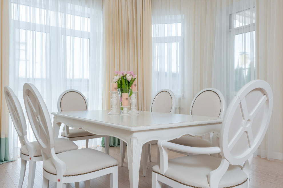 En esta imagen podemos apreciar una mesa de salón y sus sillas que la acompañan. Un diseño con curvas delicadas y materiales que comparte con el estilo clásico. Ideas como esta puede tomar como referencia para diseñar su hogar. ¡Contáctese con nosotros para recibir asesoramiento!