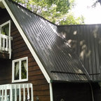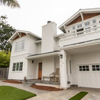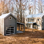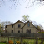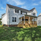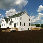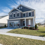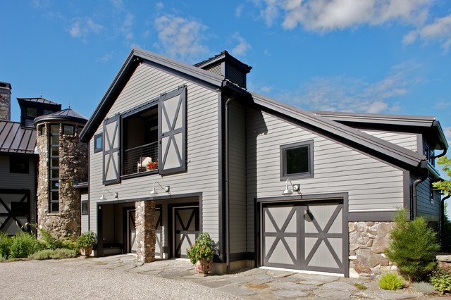 Foto de fachada gris, de estilo de casa de campo, grande, de dos plantas, con revestimiento de vinilo y tejado a dos aguas — Houzz