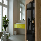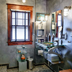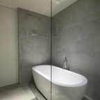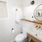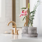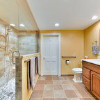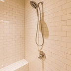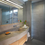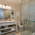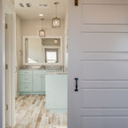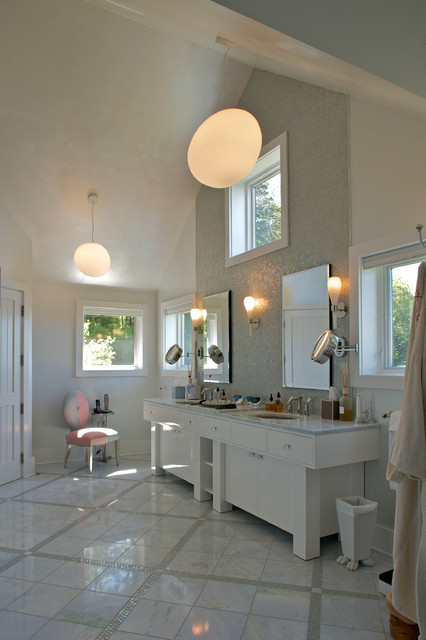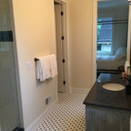 Ejemplo de cuarto de baño principal, de estilo de casa de campo, grande, con armarios con paneles lisos, puertas de armario blancas, baldosas y/o azulejos grises, suelo de baldosas de porcelana, lavabo bajoencimera y encimera de granito — Houzz